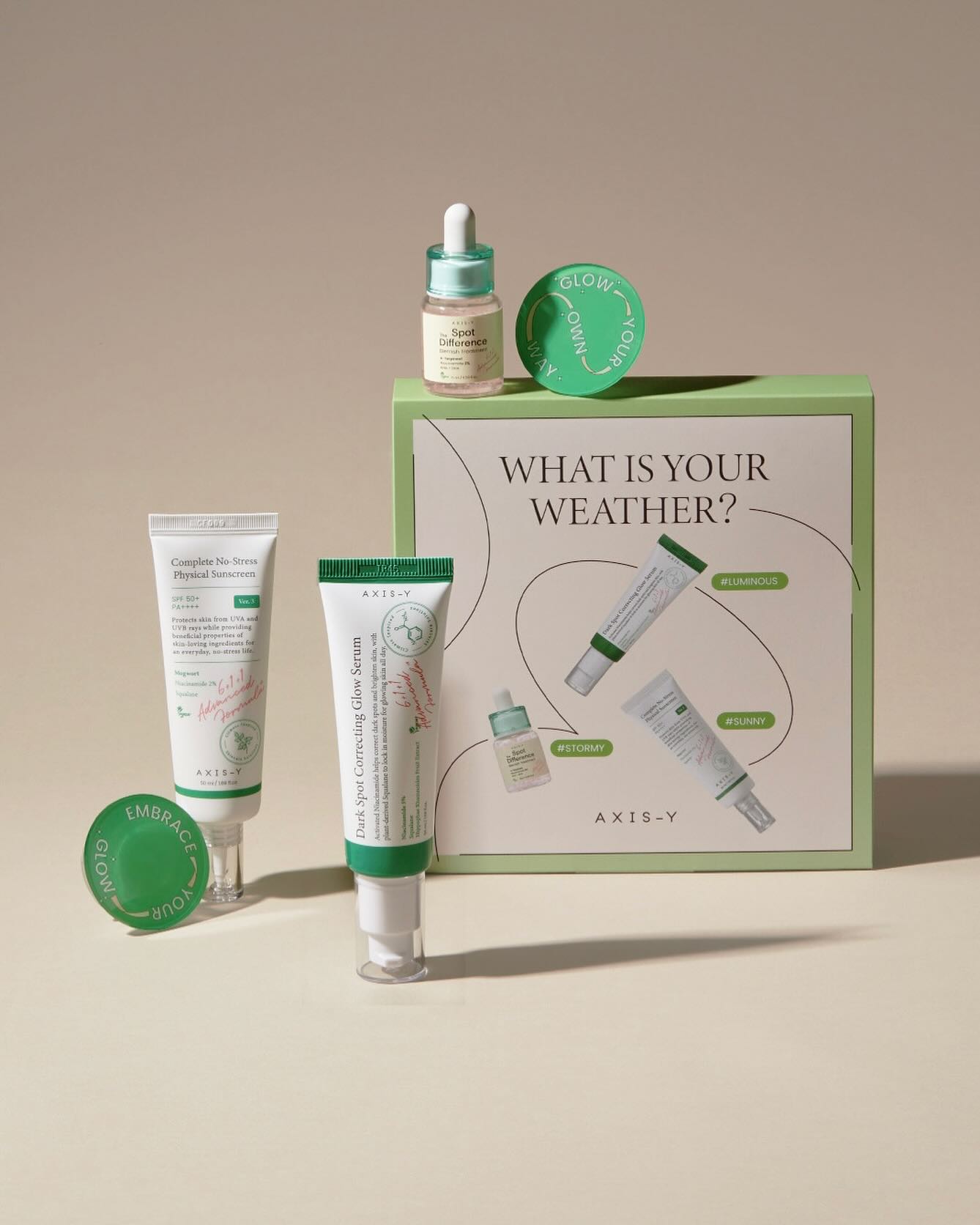 AXIS-Y "What Is Your Weather Beauty Box" is a tailor-made skin care kit that focuses on addressing specific skin needs depending on the weather and environment. This box contains five hand-picked products that work together to balance and improve the condition of your skin, whether it's a sunny day or a humid and rainy day.