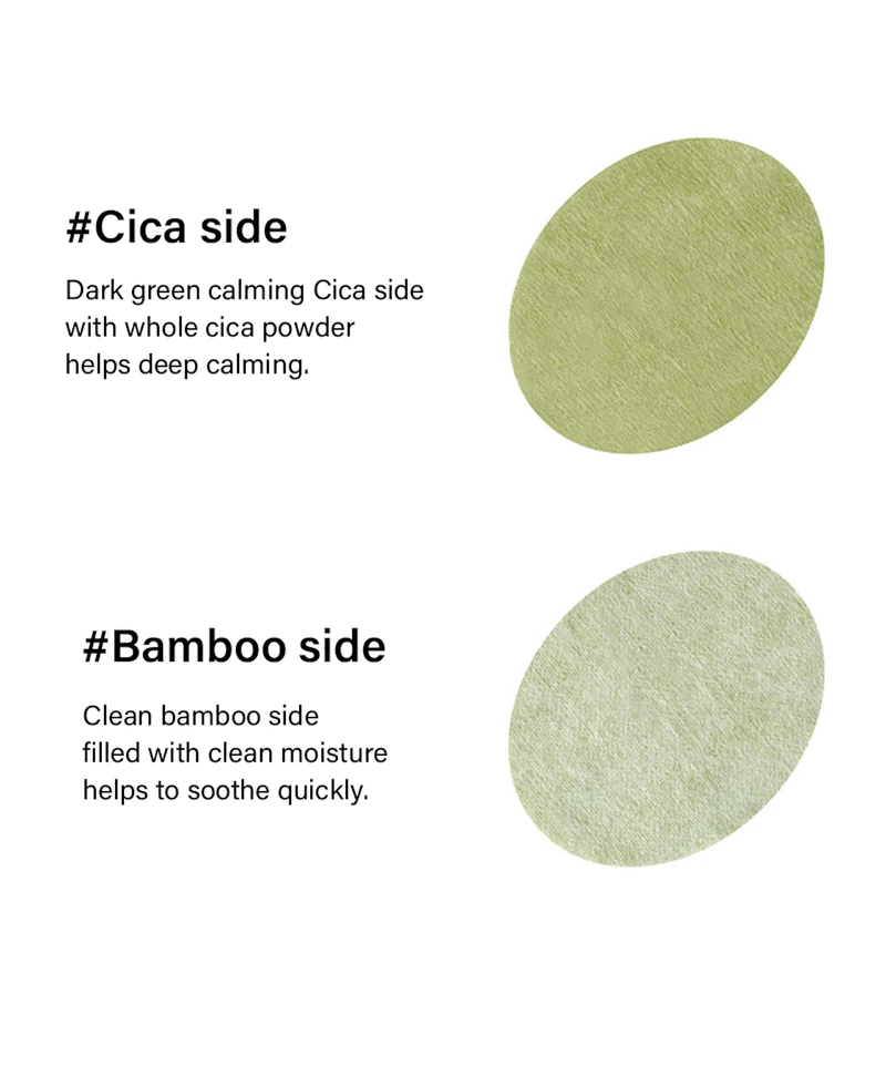 The dual-sided pad features a bamboo side and cica side. Use the bamboo side for a soothing effect and a quick dose of hydration. At the same time, the Cica end made with grounded Cica leaves is optimised for calming irritation and delivering an intensive cooling effect. Suitable for all skin types.