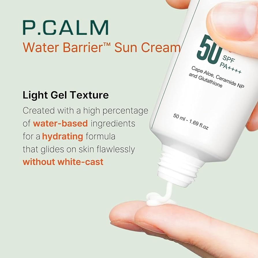 Introducing the P.Calm Water Barrier Sun Cream SPF50+ PA++++, the latest K-beauty sunscreen sensation of 2023! This soothing sunscreen features four chemical UV filters that provide broad-spectrum protection against harmful UV rays while simultaneously enhancing your skin barrier function.